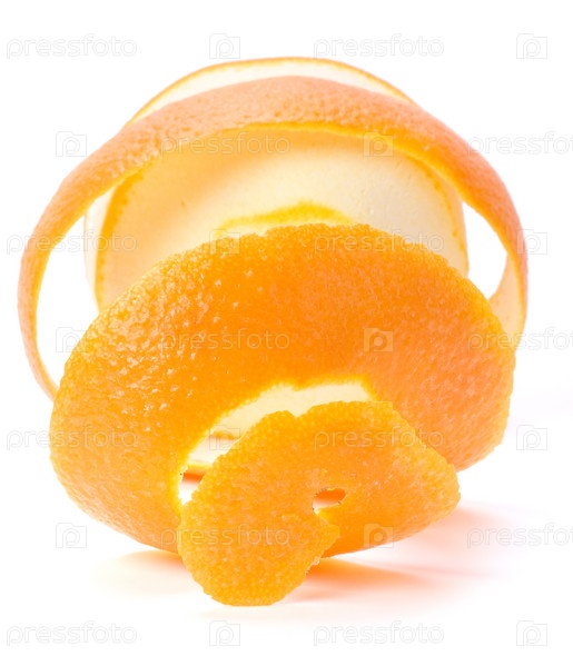 Апельсин с очищенной в виде спирали кожей на белом фоне