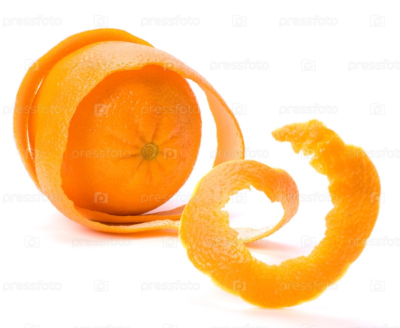 Апельсин с очищенной в виде спирали кожей на белом фоне