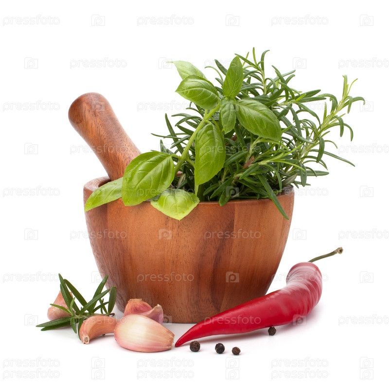Травы и специи в деревянной ступе