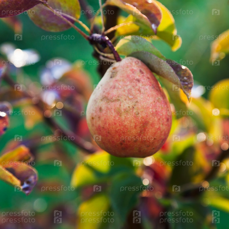 Спелая красно-желтая груша на дереве