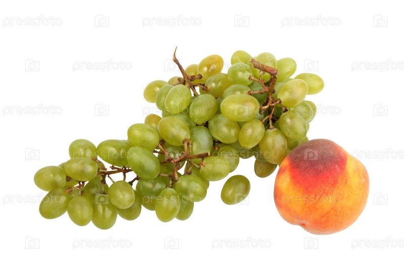 Гроздь зеленого винограда и персик на белом фоне