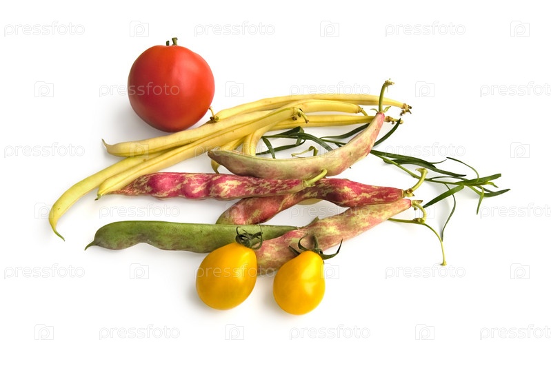 Фасоль, помидоры и эстрагон на белом фоне