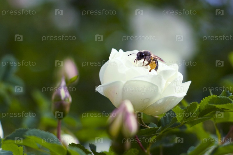 Оса на бутоне белой розы