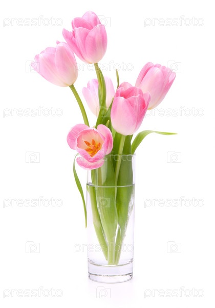 Букет розовых тюльпанов в вазе, изолированный на белом фоне