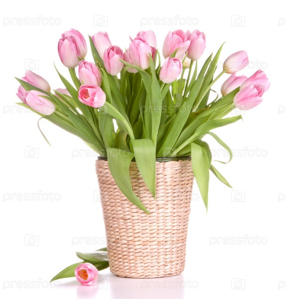 Букет розовых тюльпанов в вазе, изолированный на белом фоне