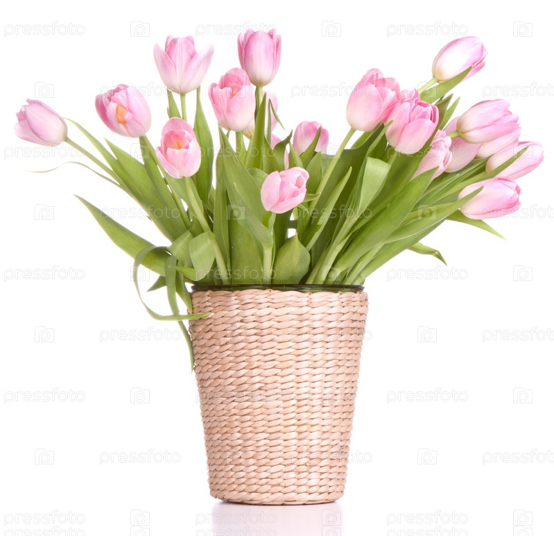 Букет розовых тюльпанов в вазе, изолированный на белом фоне