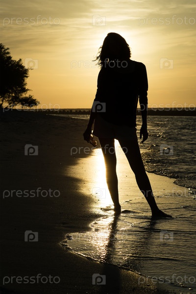 Силуэт девушки на закате у берега океана