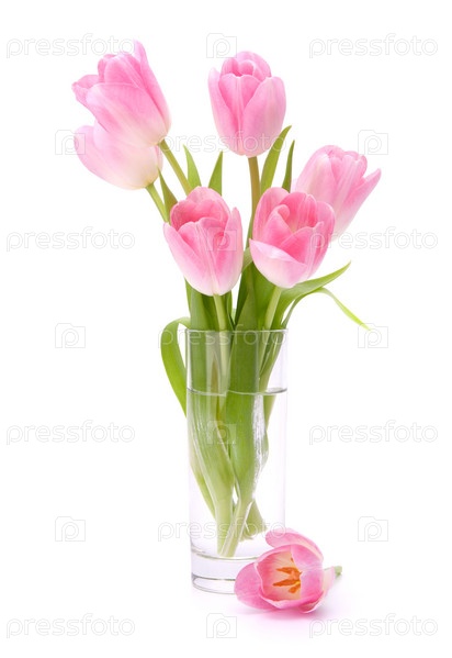 Букет розовых тюльпанов в вазе, изолированный на белом фоне
