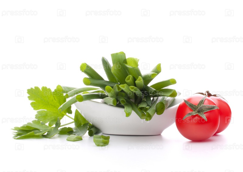 Зеленый лук и помидоры черри в миске