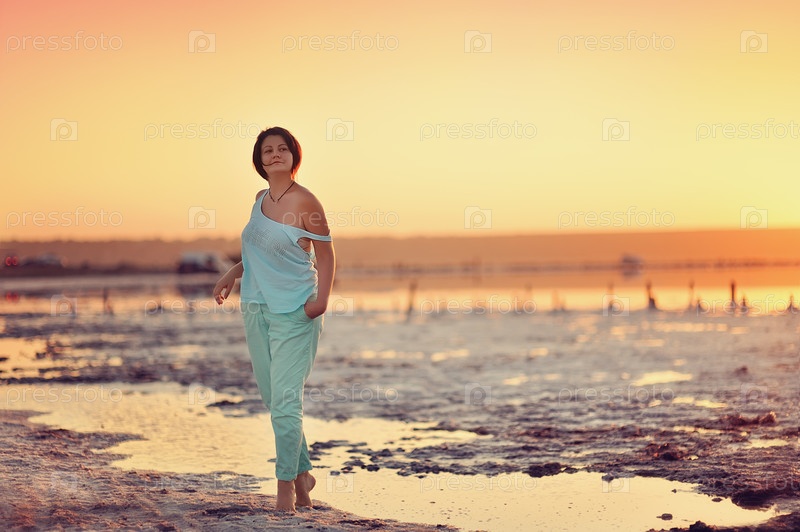 Красивая девушка позирует на пляже на закате
