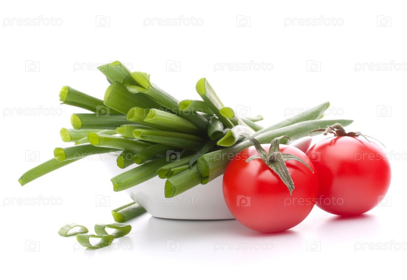 Зеленый лук и помидоры черри в миске