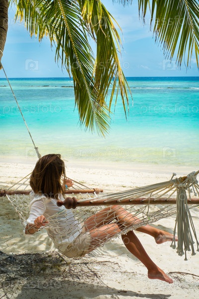 Девушка в гамаке на берегах лазурного океана, Мальдивы