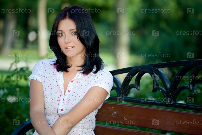 Молодая красивая девушка сидит на скамейке в парке