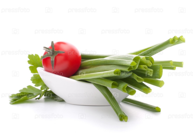 Зеленый лук и помидоры черри в миске