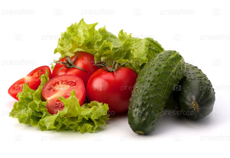 Помидоры, листья салата и огурцы