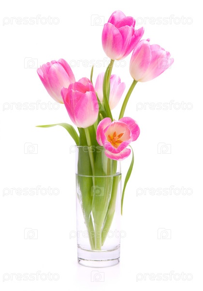 Букет розовых тюльпанов в вазе, изолированный на белом фоне