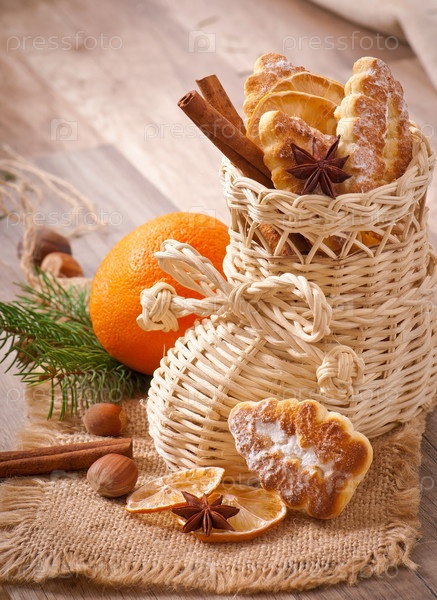 Плетеный рождественский чулок с печеньем, корицей, лимоном и звездочками аниса