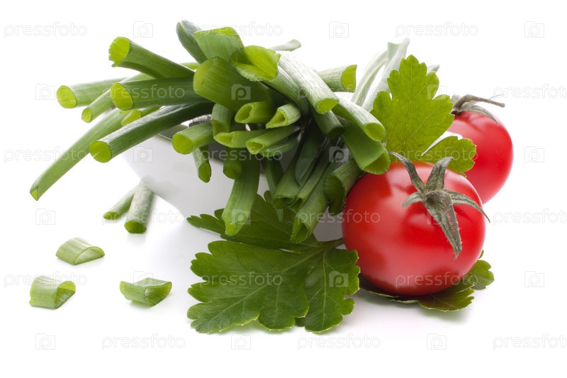 Зеленый лук и помидоры черри в миске