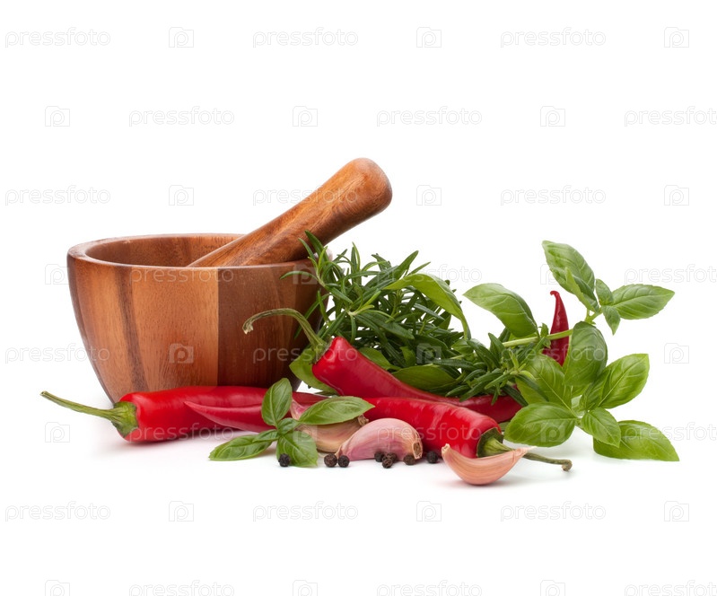 Свежие травы и специи в деревянной ступке