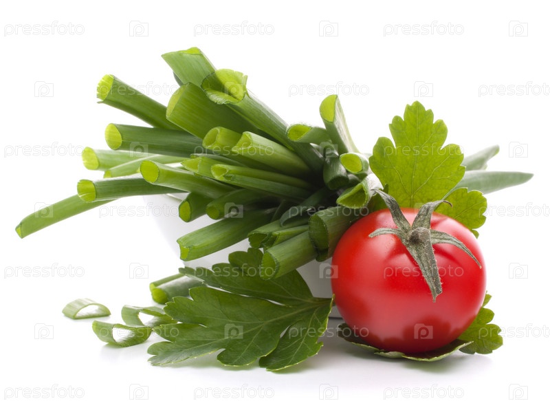 Зеленый лук и помидоры черри в миске