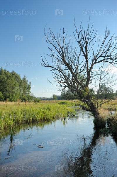 Летний пейзаж с ручкой и сухим деревом