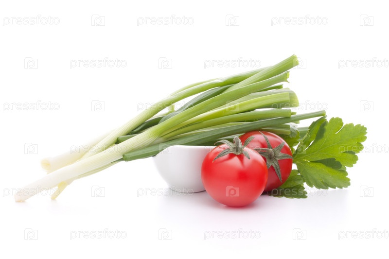 Зеленый лук и помидоры черри в миске