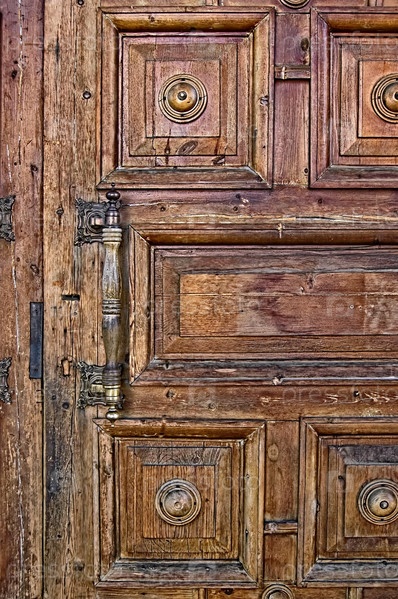 Старая двустворчатая дверь, украшенная орнаментом коричневого цвета, с бронзовой ручкой
