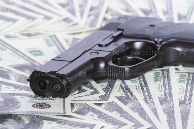 Черный автоматический пистолет на фоне долларов