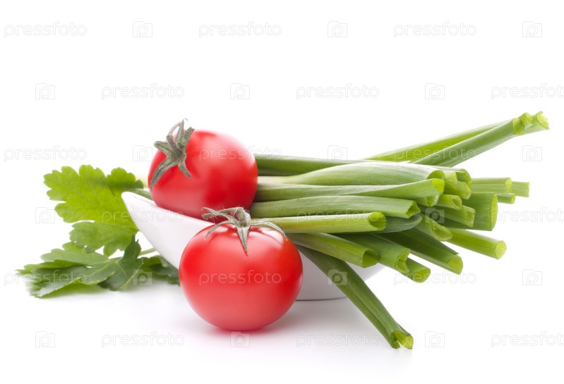 Зеленый лук и помидоры черри в миске