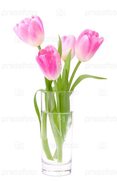 Букет розовых тюльпанов в вазе, изолированный на белом фоне