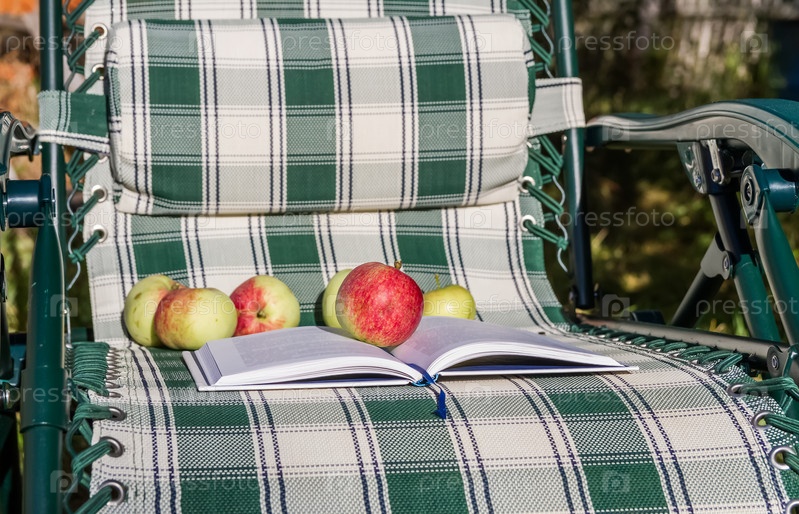 Книга и яблоки на кресле летом