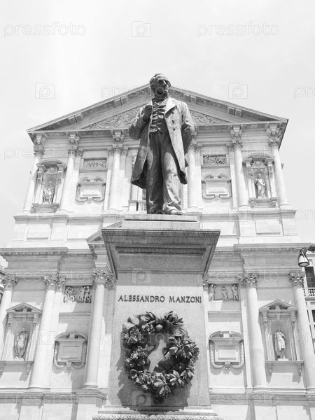 Статуя писателя Алессандро Мандзони перед церковью Сан Феделе, Милан, Италия