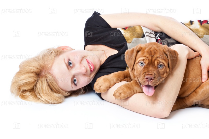 Красивая девушка лежит в обнимку с щенком бордосского дога