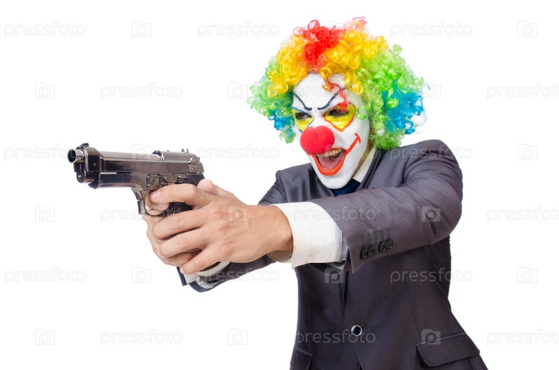 Бизнесмен-клоун с пистолетом, изолированный на белом фоне