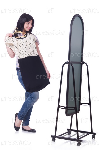 Женщина меряет новую одежду на белом