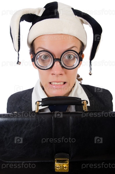 Бизнес-леди в клоунском колпаке, изолированная на белом фоне