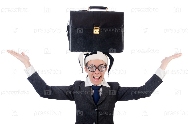 Бизнес-леди в клоунском колпаке, изолированная на белом фоне