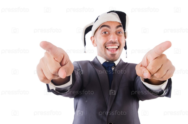 Бизнесмен в клоунском колпаке, изолированная на белом фоне