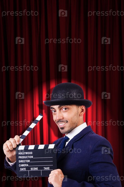 Человек с хлопушкой на фоне занавеса