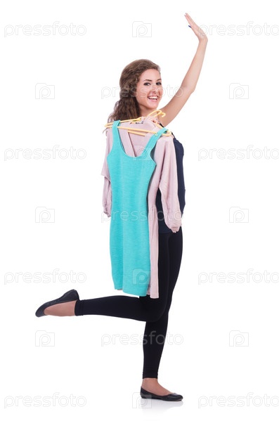 Женщина примеряет новую одежду на белом фоне