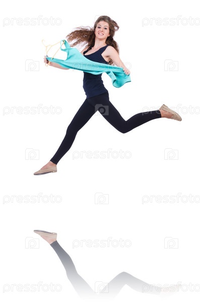 Женщина примеряет новую одежду на белом фоне