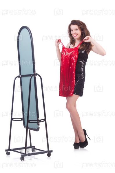 Женщина примеряет новую одежду на белом фоне