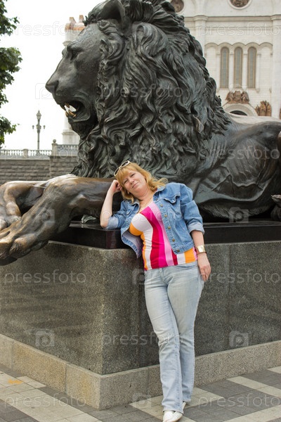 Женщина стоит возле скульптуры льва