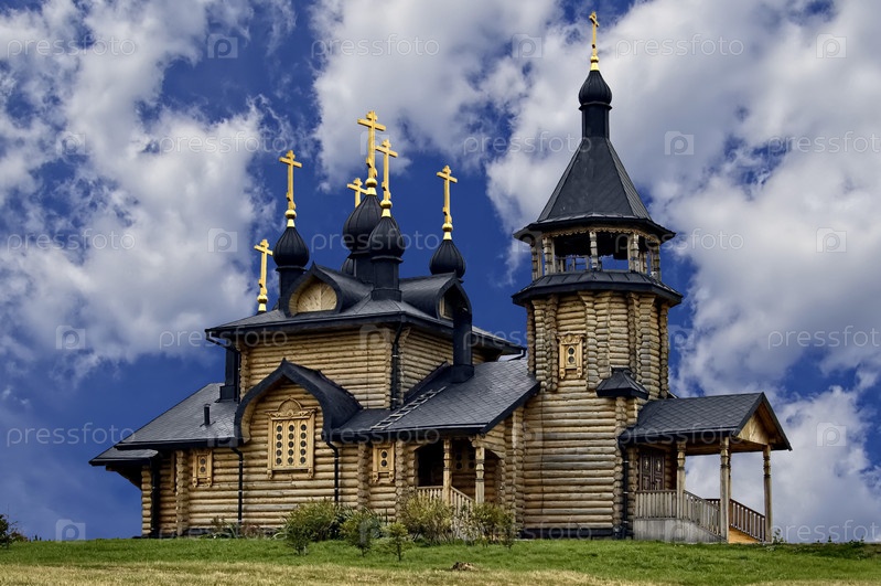 Деревянный храм во имя Всех святых во земле Сибирской на фоне синего неба. Верхотурский уезд Свердловской области