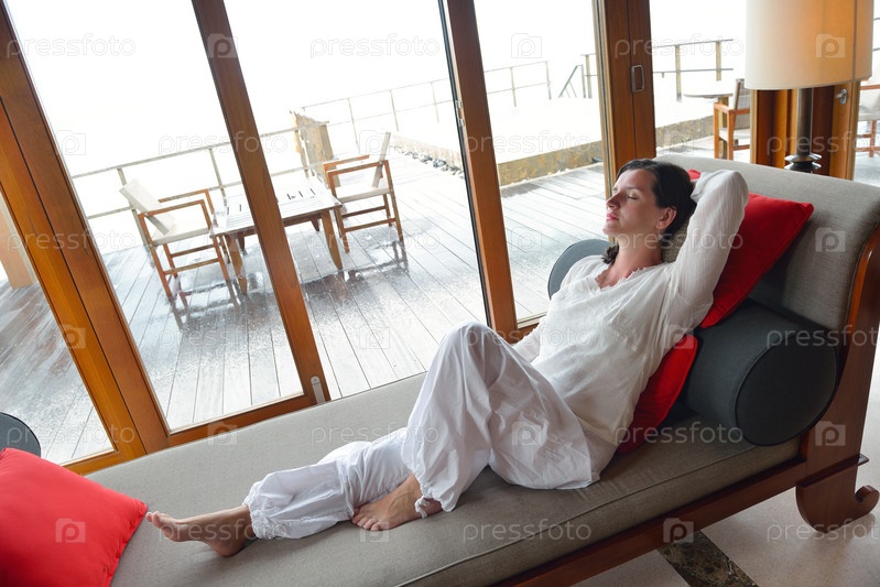 Счастливая молодая женщина отдыхает на диване у себя дома
