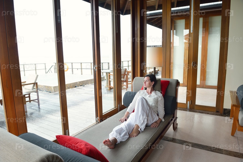 Счастливая молодая женщина отдыхает на диване у себя дома