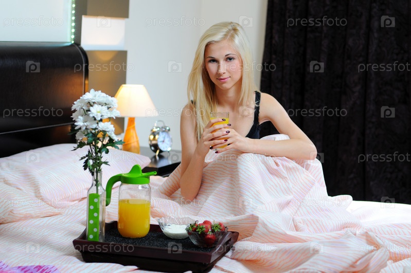 Молодая красивая женщина завтракает в постели