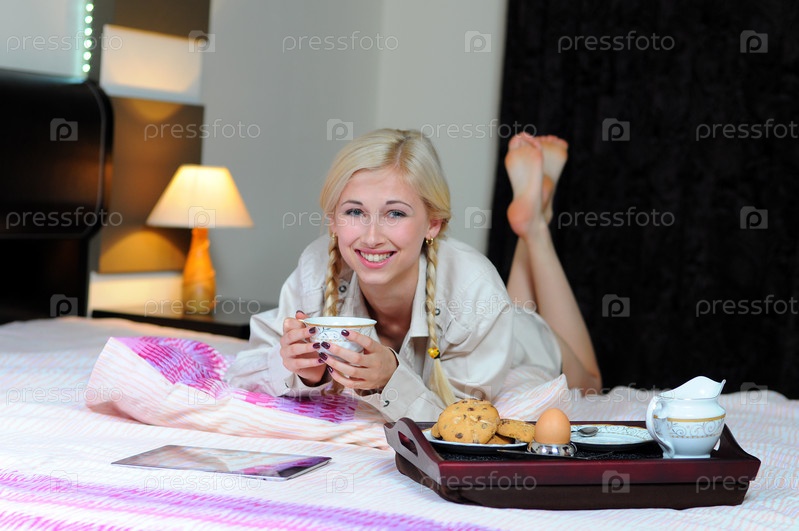 Молодая красивая женщина завтракает в постели