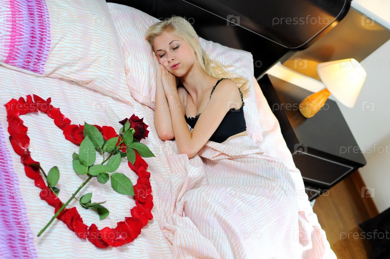 Женщина лежит в постели с сердцем из лепестков роз