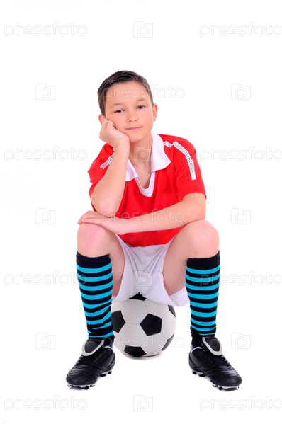 Мальчик с футбольным мячом на белом фоне
